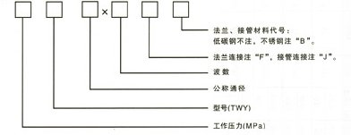 表示:公稱通徑為500mm,工作壓力為0.6MPa(6kg/cm2)波數(shù)為8個,不銹鋼管連接的軸向型外壓式波紋補償器。