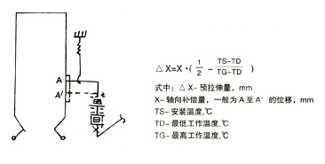 5.22 靠近燃燒器入口處垂直安裝,此時(shí)補(bǔ)償器主要通過軸向伸縮以及少量橫向撓曲來吸收位移。為減少A點(diǎn)受力,補(bǔ)償器按預(yù)拉伸狀態(tài)安裝,預(yù)拉伸量按下式計(jì)算: